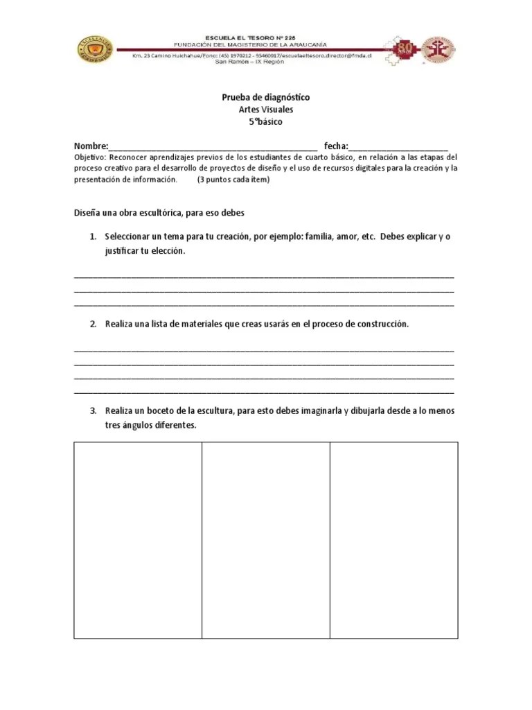 1º y 2º semestre 2011. Querida alumna, no olvides realizar semanalmente las actividades enviadas, ya que éstas serán evaluadas sumativamente en tu croquera, una vez que regresemos a clases. Colegio polivalente jesús servidor docente: Artes visuales 5° guia semana 19 al 23 octubre; 10 de enero de 2011. Artes visuales 5° básico presenta los objetivos priorizados y los contenidos asociados. Hacer clic para expandir la información del documento. Colegio polivalente jesús servidor docente: