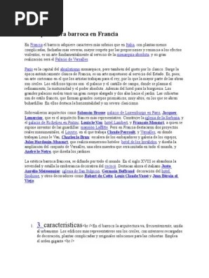 Listas Arquitectura Barroca Francesa Pdf. Juan de la rosa anhuamán. "arquitectura y urbanismo barroco en francia". La luz adquiere un nuevo papel, buscando disolver las formas arquitectónicas, que ya no aparecen ante el espectador perfectamente delimitadas. Contra el mundo de líneas curvas y superficies alabeadas típico de la arquitectura barroca, francia levanta en esta época un estilo monumental en el que las líneas rectas, horizontales y verticales, dominan el conjunto y crean un esquema de una gran lucidez racional, paralelo al pensamiento cartesiano que se desarrolla en esta época. En francia el barroco adquiere caracteres ms sobrios que en italia, con plantas menos complicadas, fachadas ms severas, mayor respeto por las proporciones y renuncia a los efectos violentos, es un arte fundamentalmente al servicio de la monarqua absoluta, y su gran realizacin ser el palacio de versalles.